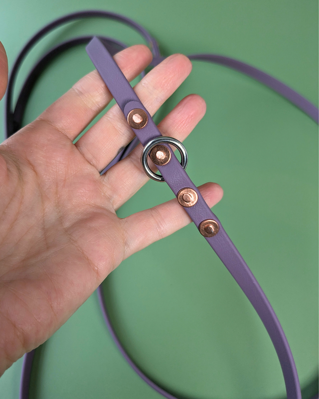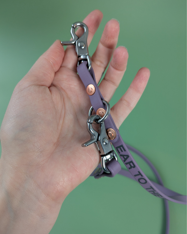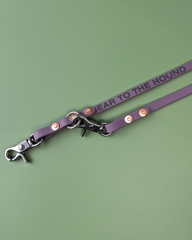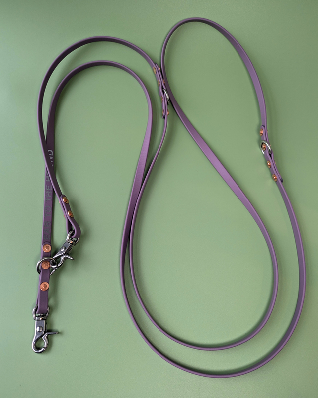 Made from lightweight 9mm wide Biothane this lead adjusts to 3 different lengths, so you can easily go from pavement to sniffy park walk. It's designed so that when clipped on the middle length the lead can also be worn cross body in a hands free style.